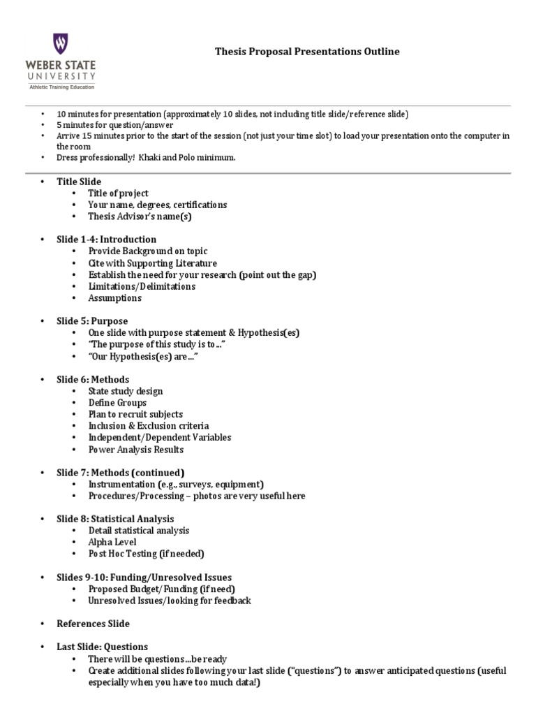 Thesis Presentation Outline I. Introduction (2 screens) a. Self b. Project c. Outline of presentation/technical analysis and breadth topics II. Project Background (2 screens) a. Location b. Building type and function c. General building statistics i. Contract type and overall cost ii. Project schedule iii - • research proposal is an outline of your proposed project • makes an positive & powerful first impression • considerable factor in accepting your phd proposal for university accepting phd students onto a research programme depends on many factors, such as nature of your proposed research, the quality of your ideas, your ability to commit to an · Thesis Proposal Presentation 1. MEASURING THE SOFTWARE ARCHITECTURE UNDERSTANDABILITY IN OBJECT-ORIENTED SYSTEMS T U R K I F. A L S H A M M A R Y Thesis Proposal 2. Outline Introduction Research Questions Discussion Methodology Benefits of the study Chapters of the thesis Time Line Conclusion 3